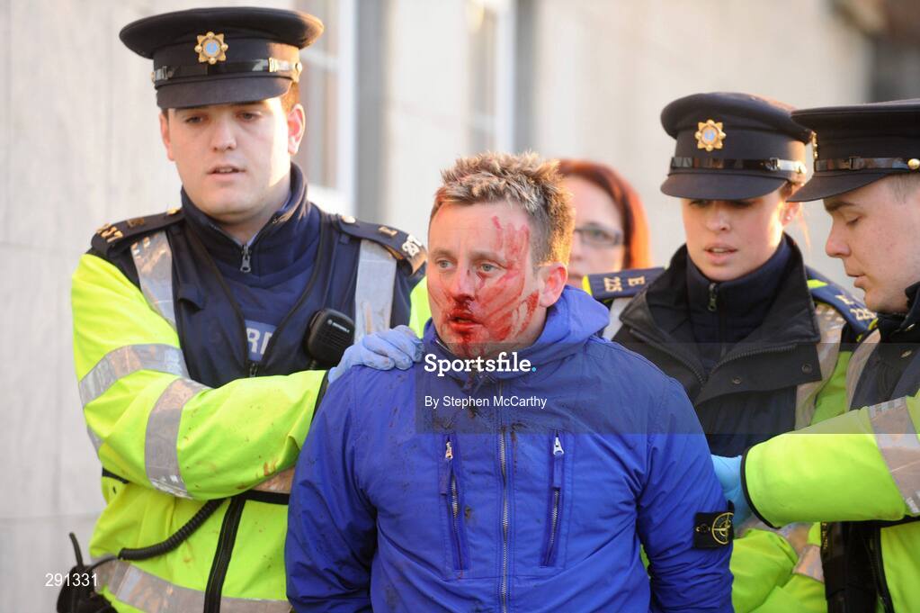 15 April 2008; A Linfield supporter is escorted from the ground by members of An Garda Síochána. Setanta Cup Group 2, St Patrick's Athletic v Linfield, Richmond Park, Inchicore, Dublin. Picture credit: Stephen McCarthy / SPORTSFILE