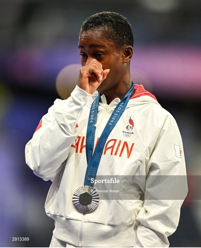 9 August 2024; An emotional silver medalist Salwa Eid Naser of Team Bahrain during the victory ceremony for the women's 400m at the Stade de France during the 2024 Paris Summer Olympic Games in Paris, France. Photo by Brendan Moran/Sportsfile
