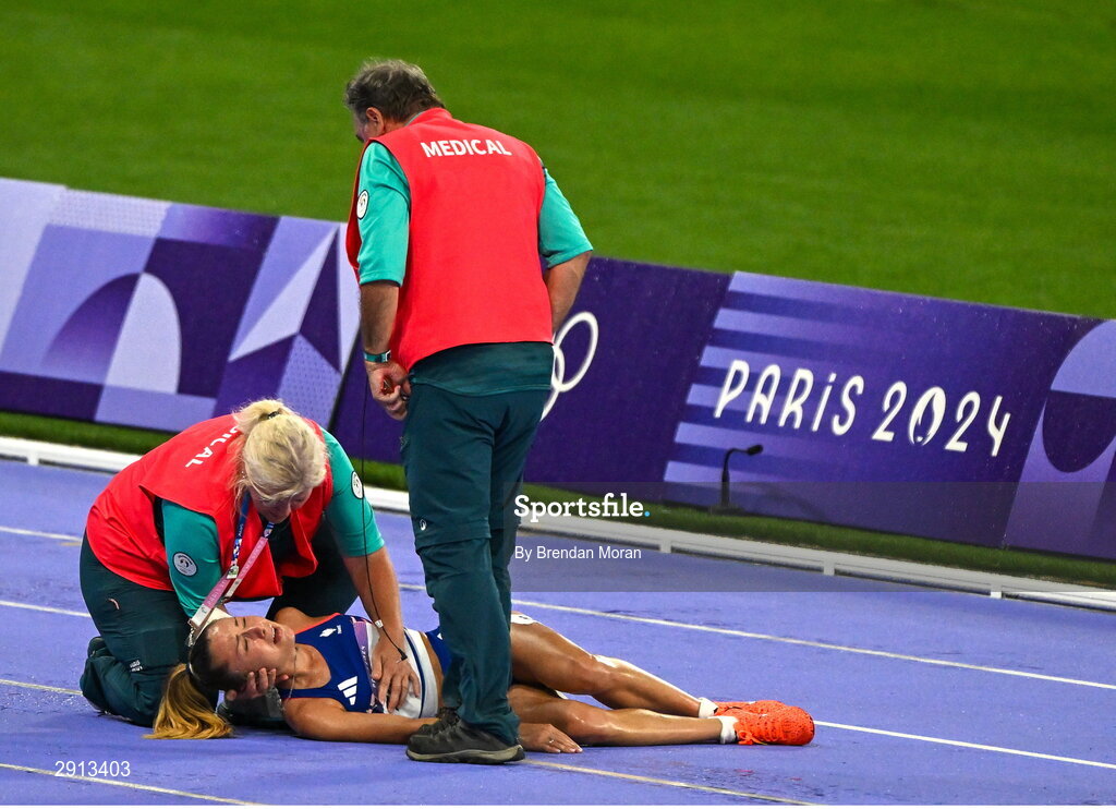 9 August 2024; Alessia Zarbo of Team France receives medical attention during the women's 10000m final at the Stade de France during the 2024 Paris Summer Olympic Games in Paris, France. Photo by Brendan Moran/Sportsfile