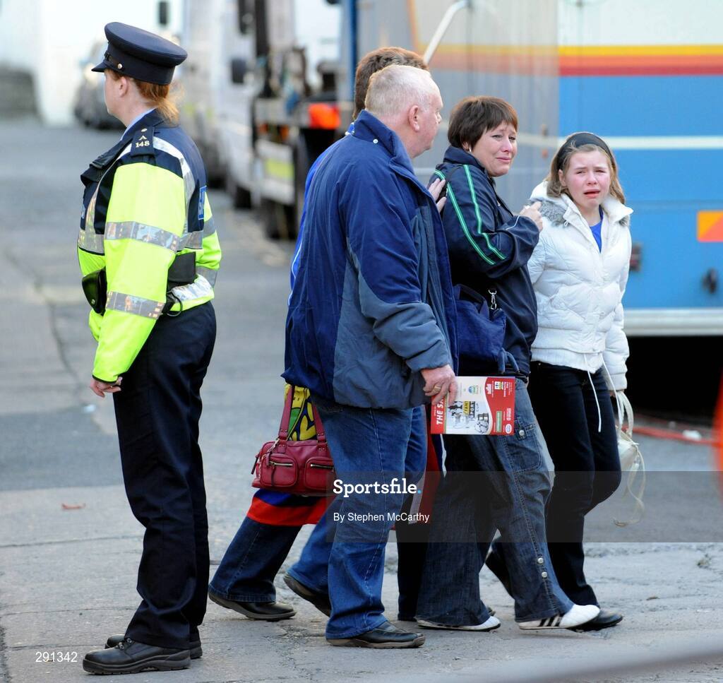 15 April 2008; Crying Linfield supporters make their way into the ground after violence outside the ground. Setanta Cup Group 2, St Patrick's Athletic v Linfield, Richmond Park, Inchicore, Dublin. Picture credit: Stephen McCarthy / SPORTSFILE