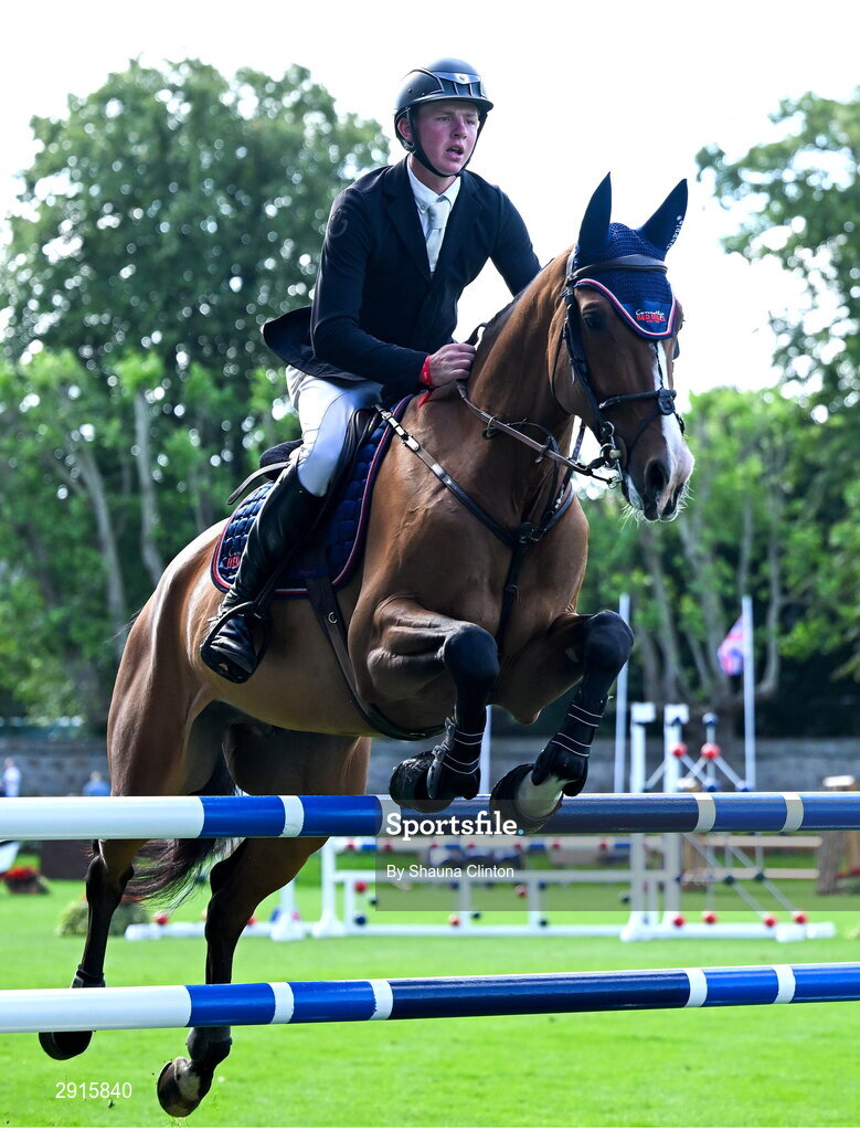 14 August 2024; Max Foley competing on Hhs Arezzo in the Six Year Olds competition during the Dublin Horse Show 2024 at the RDS in Dublin. Photo by Shauna Clinton/Sportsfile
