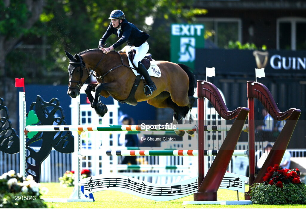 14 August 2024; Kian Dore competing on One Day Maybe in the Six Year Olds competition during the Dublin Horse Show 2024 at the RDS in Dublin. Photo by Shauna Clinton/Sportsfile