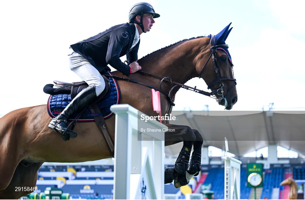 14 August 2024; Max Foley competing on Hhs Arezzo in the Six Year Olds competition during the Dublin Horse Show 2024 at the RDS in Dublin. Photo by Shauna Clinton/Sportsfile
