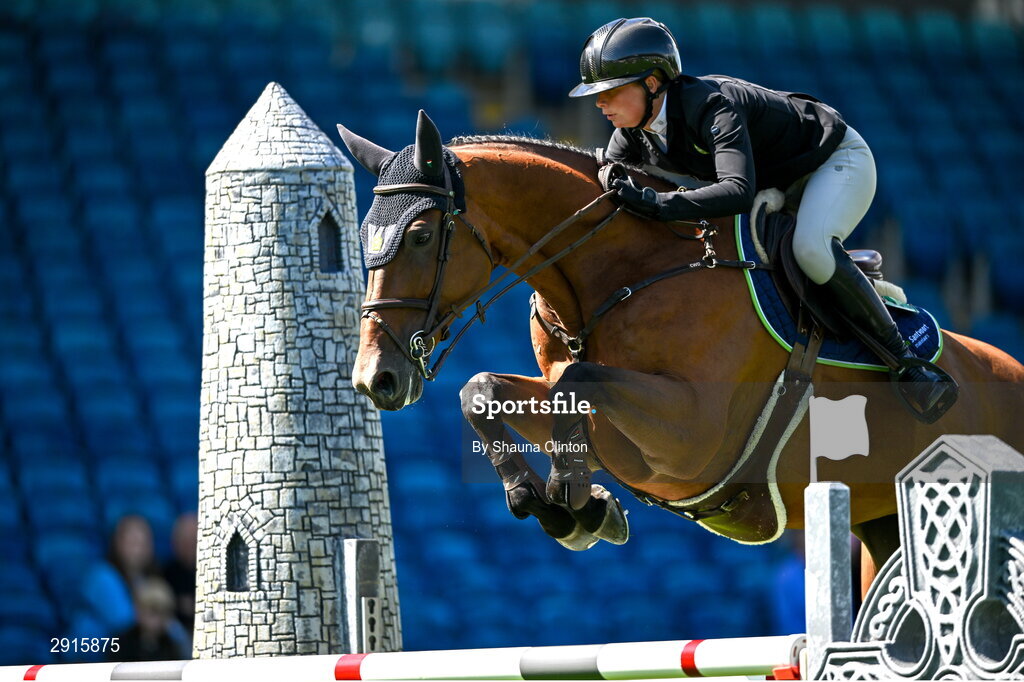 14 August 2024; Mel Thijssen of The Netherlands competing on Juice in the Speed Stakes during the Dublin Horse Show 2024 at the RDS in Dublin. Photo by Shauna Clinton/Sportsfile