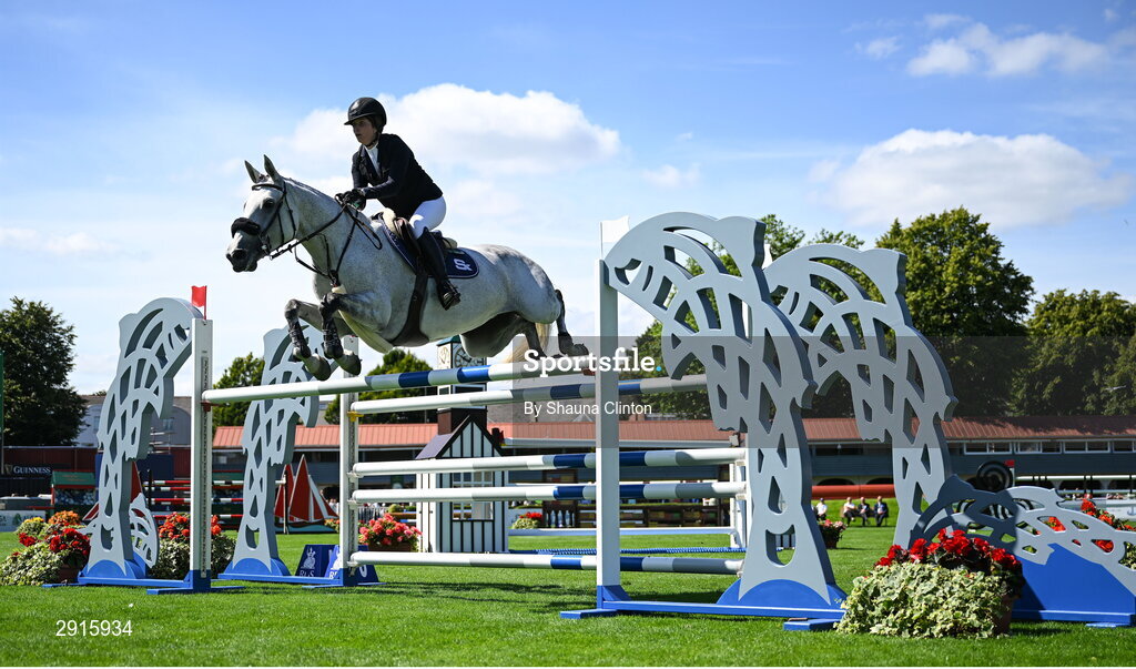 14 August 2024; Emilie Conter of Belgium competing on Ocean Quality in the Minerva Stakes during the Dublin Horse Show 2024 at the RDS in Dublin. Photo by Shauna Clinton/Sportsfile
