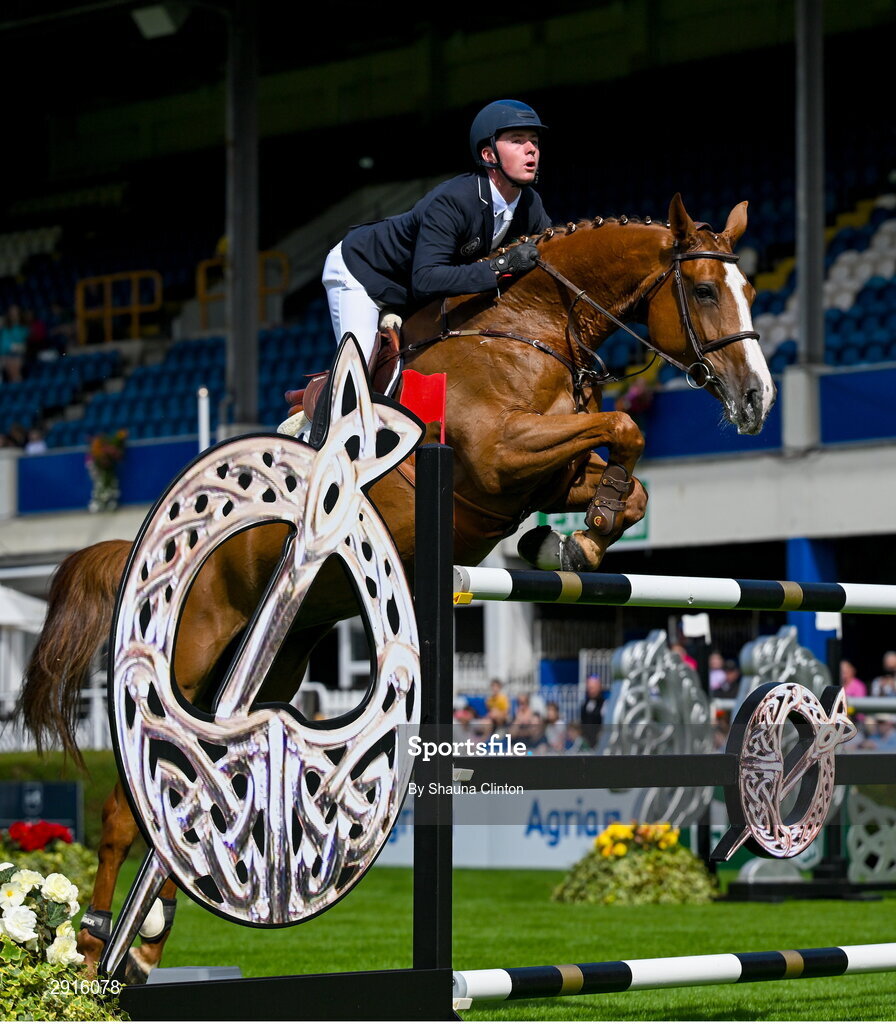14 August 2024; Francis Derwin of Ireland competing on Parvati Aeg in the Speed Stakes during the Dublin Horse Show 2024 at the RDS in Dublin. Photo by Shauna Clinton/Sportsfile