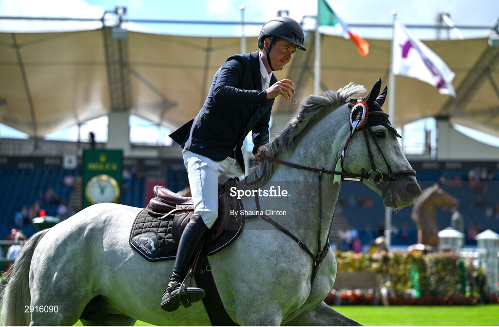 14 August 2024; Bertram Allen of Ireland on Gary de Cerisy after placing eighth in the Speed Stakes during the Dublin Horse Show 2024 at the RDS in Dublin. Photo by Shauna Clinton/Sportsfile
