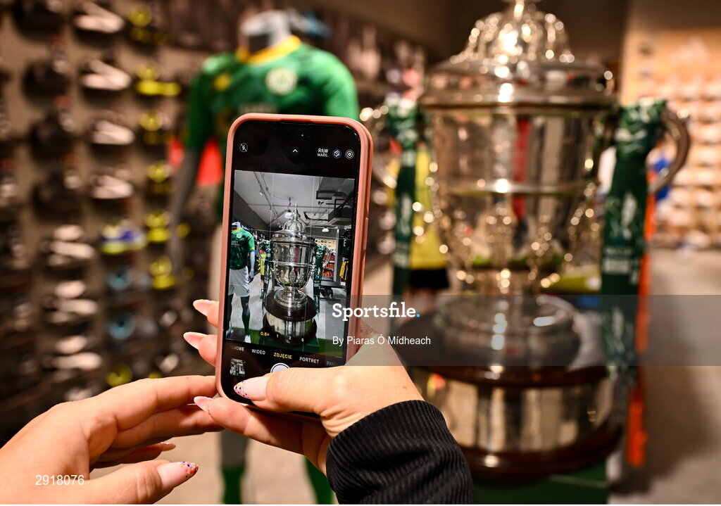 18 August 2024; A Kerry FC supporter takes a picture at the Sports Direct Men’s FAI Cup Trophy Tour at Sports Direct, Tralee, ahead of the Sports Direct Men’s FAI Cup Third Round clash between Kerry and Bohemians at Mounthawk Park in Tralee, Kerry. Photo by Piaras Ó Mídheach/Sportsfile