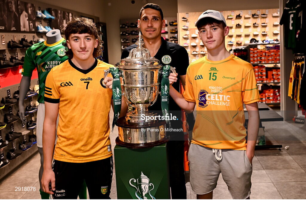 18 August 2024; Kyron McColgan, left, Devyn McColgan with Kerry FC goalkeeper Antonio Tuta at the Sports Direct Men’s FAI Cup Trophy Tour at Sports Direct, Tralee, ahead of the Sports Direct Men’s FAI Cup Third Round clash between Kerry and Bohemians at Mounthawk Park in Tralee, Kerry. Photo by Piaras Ó Mídheach/Sportsfile