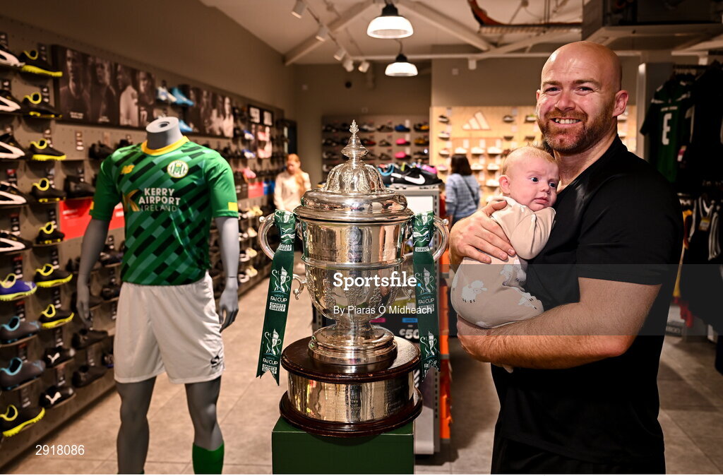 18 August 2024; Former League of Ireland goalkeeper Robert Birdsall with his son Robbie, age 10 weeks, at the Sports Direct Men’s FAI Cup Trophy Tour at Sports Direct, Tralee, ahead of the Sports Direct Men’s FAI Cup Third Round clash between Kerry and Bohemians at Mounthawk Park in Tralee, Kerry. Photo by Piaras Ó Mídheach/Sportsfile