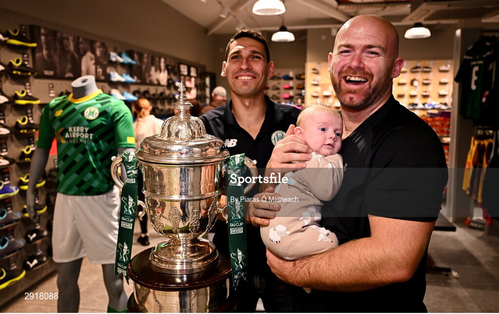 18 August 2024; Former League of Ireland goalkeeper Robert Birdsall with his son Robbie, age 10 weeks, alongside Kerry FC goalkeeper Antonio Tuta at the Sports Direct Men’s FAI Cup Trophy Tour at Sports Direct, Tralee, ahead of the Sports Direct Men’s FAI Cup Third Round clash between Kerry and Bohemians at Mounthawk Park in Tralee, Kerry. Photo by Piaras Ó Mídheach/Sportsfile