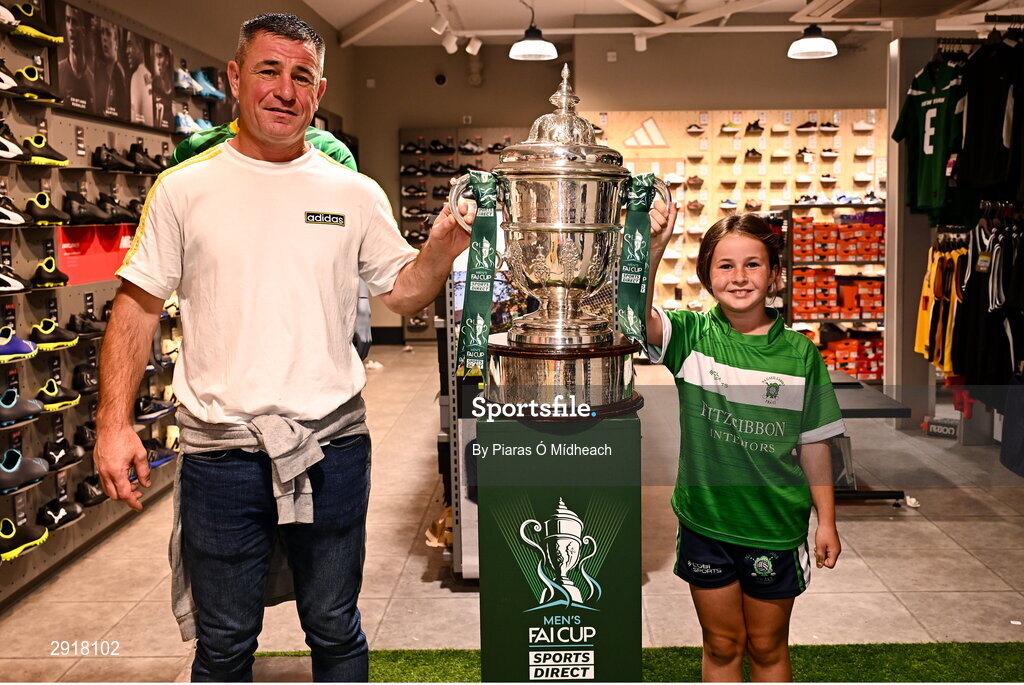 18 August 2024; Patrick Griffin with his daughter Evie, from Tralee, at the Sports Direct Men’s FAI Cup Trophy Tour at Sports Direct, Tralee, ahead of the Sports Direct Men’s FAI Cup Third Round clash between Kerry and Bohemians at Mounthawk Park in Tralee, Kerry. Photo by Piaras Ó Mídheach/Sportsfile