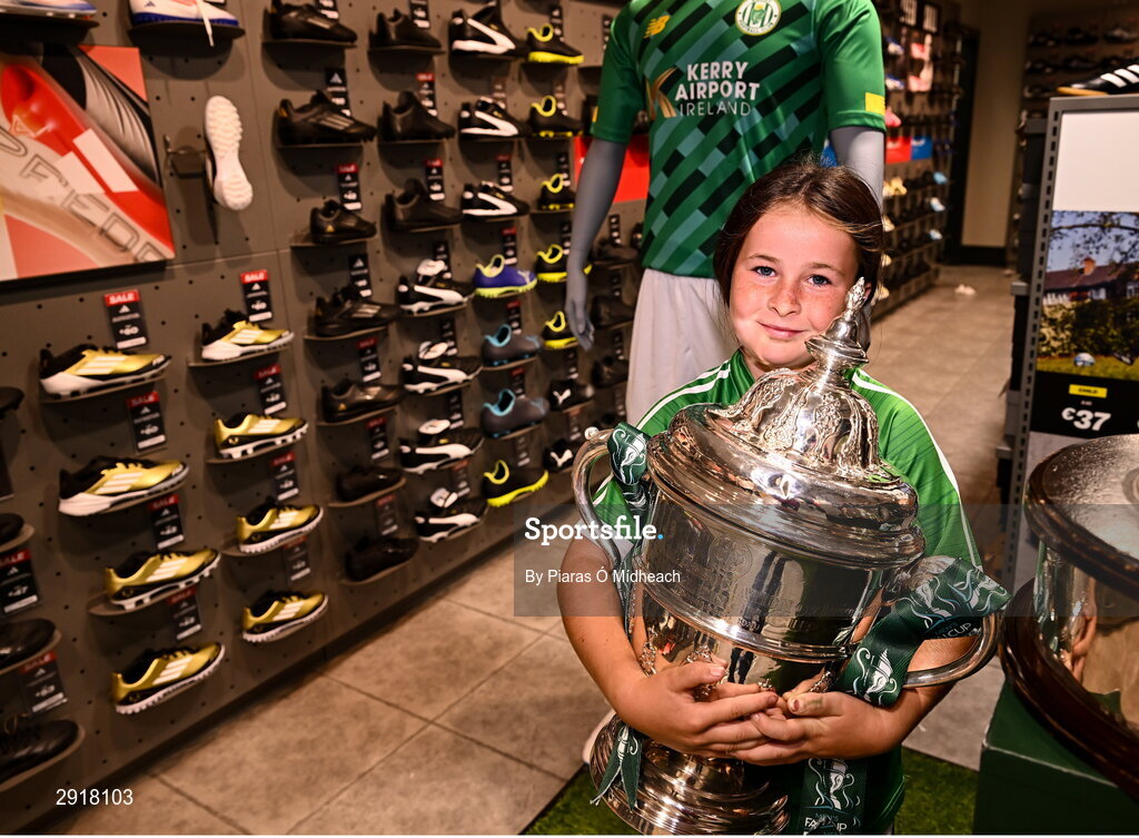 18 August 2024; Evie Griffin, from Tralee, at the Sports Direct Men’s FAI Cup Trophy Tour at Sports Direct, Tralee, ahead of the Sports Direct Men’s FAI Cup Third Round clash between Kerry and Bohemians at Mounthawk Park in Tralee, Kerry. Photo by Piaras Ó Mídheach/Sportsfile