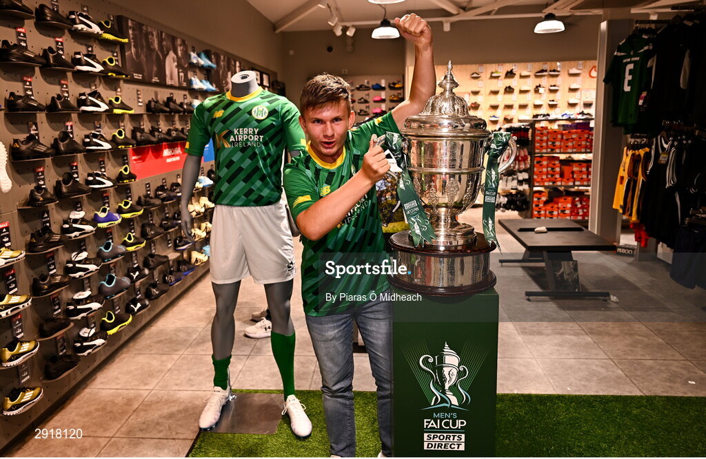 18 August 2024; Kerry FC supporter Michael Kuras, from Tralee, at the Sports Direct Men’s FAI Cup Trophy Tour at Sports Direct, Tralee, ahead of the Sports Direct Men’s FAI Cup Third Round clash between Kerry and Bohemians at Mounthawk Park in Tralee, Kerry. Photo by Piaras Ó Mídheach/Sportsfile