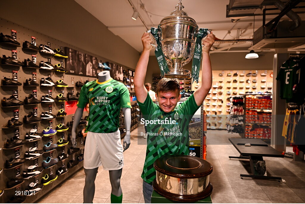 18 August 2024; Kerry FC supporter Michael Kuras, from Tralee, at the Sports Direct Men’s FAI Cup Trophy Tour at Sports Direct, Tralee, ahead of the Sports Direct Men’s FAI Cup Third Round clash between Kerry and Bohemians at Mounthawk Park in Tralee, Kerry. Photo by Piaras Ó Mídheach/Sportsfile