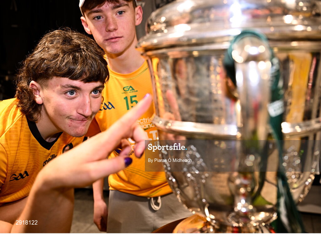 18 August 2024; Kyron McColgan, left, Devyn McColgan with Kerry FC goalkeeper Antonio Tuta at the Sports Direct Men’s FAI Cup Trophy Tour at Sports Direct, Tralee, ahead of the Sports Direct Men’s FAI Cup Third Round clash between Kerry and Bohemians at Mounthawk Park in Tralee, Kerry. Photo by Piaras Ó Mídheach/Sportsfile