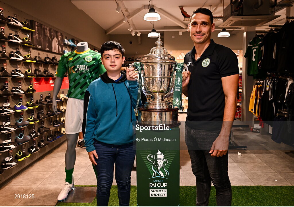 18 August 2024; Cian Thomas, from Causeway in Kerry, with Kerry FC goalkeeper Antonio Tuta at the Sports Direct Men’s FAI Cup Trophy Tour at Sports Direct, Tralee, ahead of the Sports Direct Men’s FAI Cup Third Round clash between Kerry and Bohemians at Mounthawk Park in Tralee, Kerry. Photo by Piaras Ó Mídheach/Sportsfile