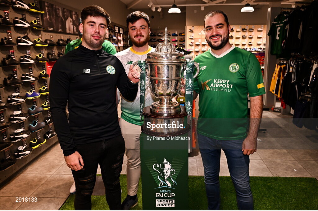 18 August 2024; Kerry FC supporters, from left, Dean Meehan, Ben Kavanagh and Seán O'Mahony at the Sports Direct Men’s FAI Cup Trophy Tour at Sports Direct, Tralee, ahead of the Sports Direct Men’s FAI Cup Third Round clash between Kerry and Bohemians at Mounthawk Park in Tralee, Kerry. Photo by Piaras Ó Mídheach/Sportsfile