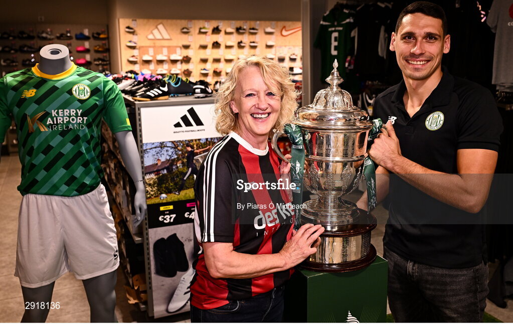 18 August 2024; Bohemians supporter Lynn O'Neill with Kerry FC goalkeeper Antonio Tuta at the Sports Direct Men’s FAI Cup Trophy Tour at Sports Direct, Tralee, ahead of the Sports Direct Men’s FAI Cup Third Round clash between Kerry and Bohemians at Mounthawk Park in Tralee, Kerry. Photo by Piaras Ó Mídheach/Sportsfile