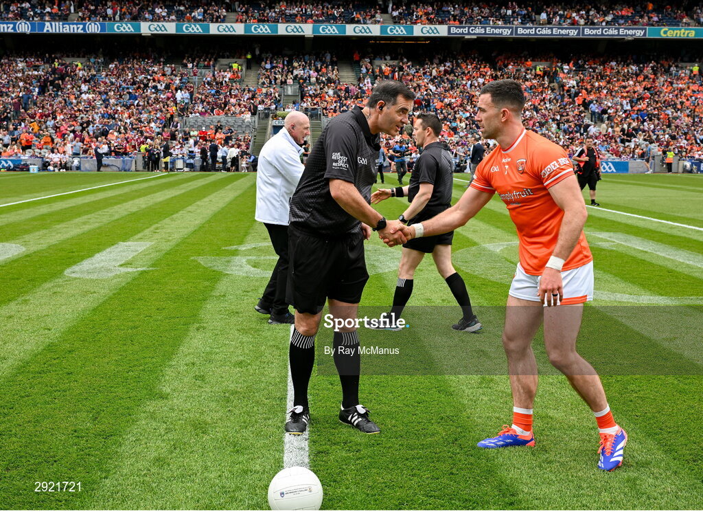 28 July 2024; Referee Sean Hurson and Armagh captain Aidan Forker before the GAA Football All-Ireland Senior Championship Final match between Armagh and Galway at Croke Park in Dublin. Photo by Ray McManus/Sportsfile