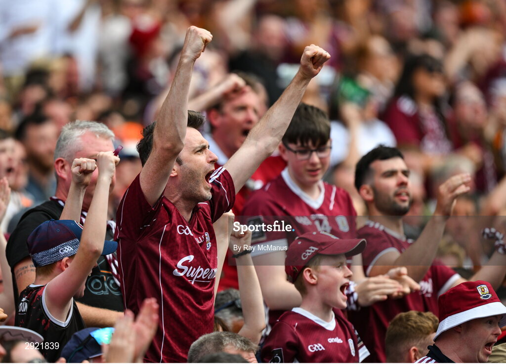 28 July 2024; Galway supporters celebrate a score during the GAA Football All-Ireland Senior Championship Final match between Armagh and Galway at Croke Park in Dublin. Photo by Ray McManus/Sportsfile
