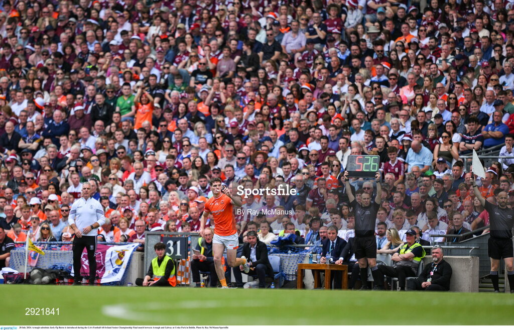 28 July 2024; Armagh substitute Jarly Óg Burns is introduced during the GAA Football All-Ireland Senior Championship Final match between Armagh and Galway at Croke Park in Dublin. Photo by Ray McManus/Sportsfile