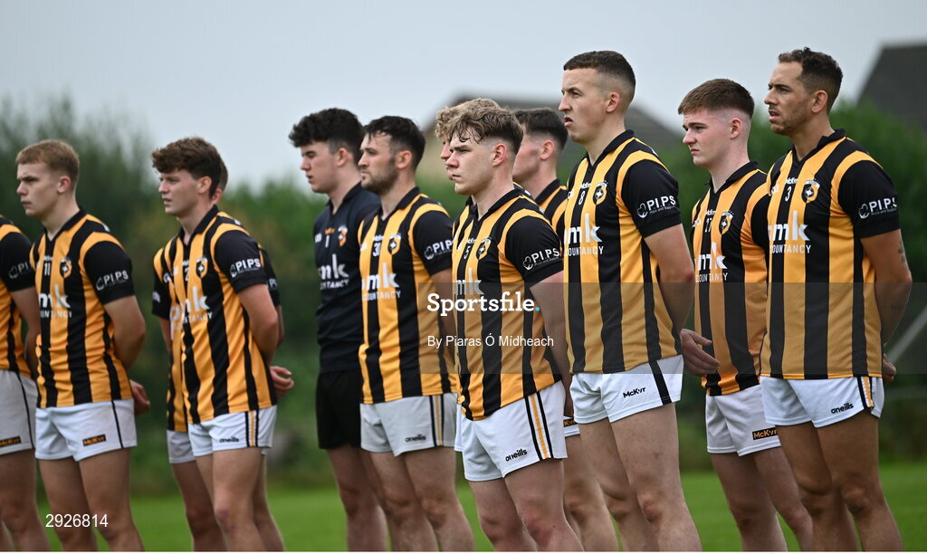 1 September 2024; Crossmaglen Rangers players stand for a minute's silence for their late team-mate Caolan Finnegan, who passed away recently, before the Armagh Senior Club Football Championship Group B second round match between High Moss Sarsfields and Crossmaglen Rangers at Fr Dan McGeown Park in Derrytrasna, Armagh. Photo by Piaras Ó Mídheach/Sportsfile