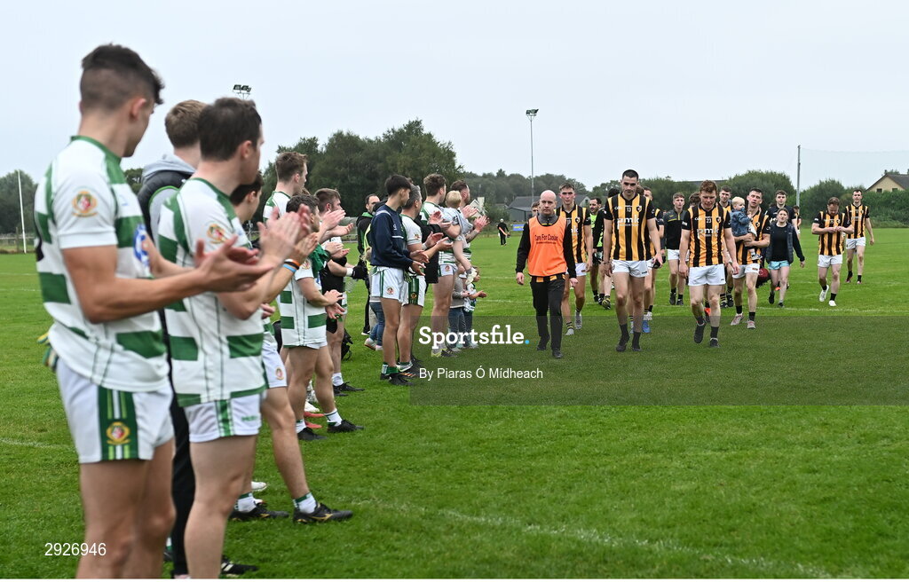 1 September 2024; High Moss Sarsfields players give a guard of honour to the Crossmaglen Rangers players after the Armagh Senior Club Football Championship Group B second round match between High Moss Sarsfields and Crossmaglen Rangers at Fr. Dan McGeown Park in Derrytrasna, Armagh. Photo by Piaras Ó Mídheach/Sportsfile