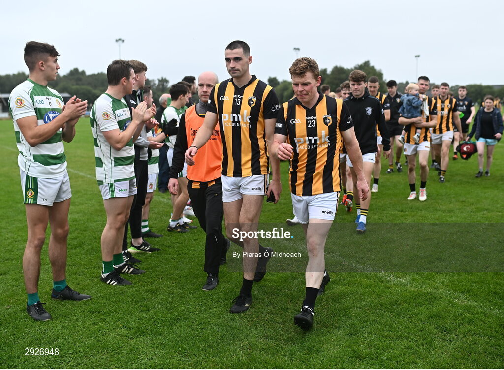 1 September 2024; High Moss Sarsfields players give a guard of honour to the Crossmaglen Rangers players, including Ronan Fitzpatrick, 13, and Garvan Carragher, 23, after the Armagh Senior Club Football Championship Group B second round match between High Moss Sarsfields and Crossmaglen Rangers at Fr. Dan McGeown Park in Derrytrasna, Armagh. Photo by Piaras Ó Mídheach/Sportsfile