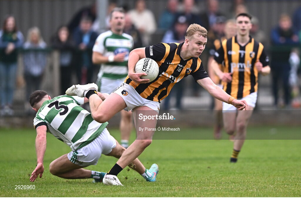 1 September 2024; Aaron O'Neill of Crossmaglen Rangers in action against James McAlinden of High Moss Sarsfields during the Armagh Senior Club Football Championship Group B second round match between High Moss Sarsfields and Crossmaglen Rangers at Fr. Dan McGeown Park in Derrytrasna, Armagh. Photo by Piaras Ó Mídheach/Sportsfile