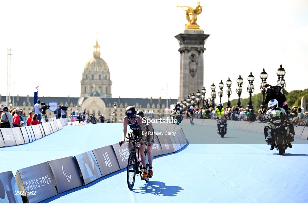 2 September 2024; Judith MacCombe, right, and guide Eimear Nicholls of Ireland in action during the women's PTVI race on day five of the Paris 2024 Paralympic Games at Pont Alexandre III in Paris, France. Photo by Ramsey Cardy/Sportsfile