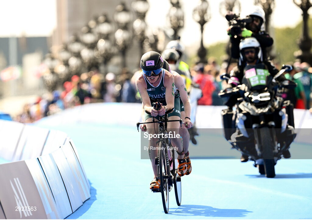 2 September 2024; Judith MacCombe, obscured, and guide Eimear Nicholls of Ireland in action during the women's PTVI race on day five of the Paris 2024 Paralympic Games at Pont Alexandre III in Paris, France. Photo by Ramsey Cardy/Sportsfile