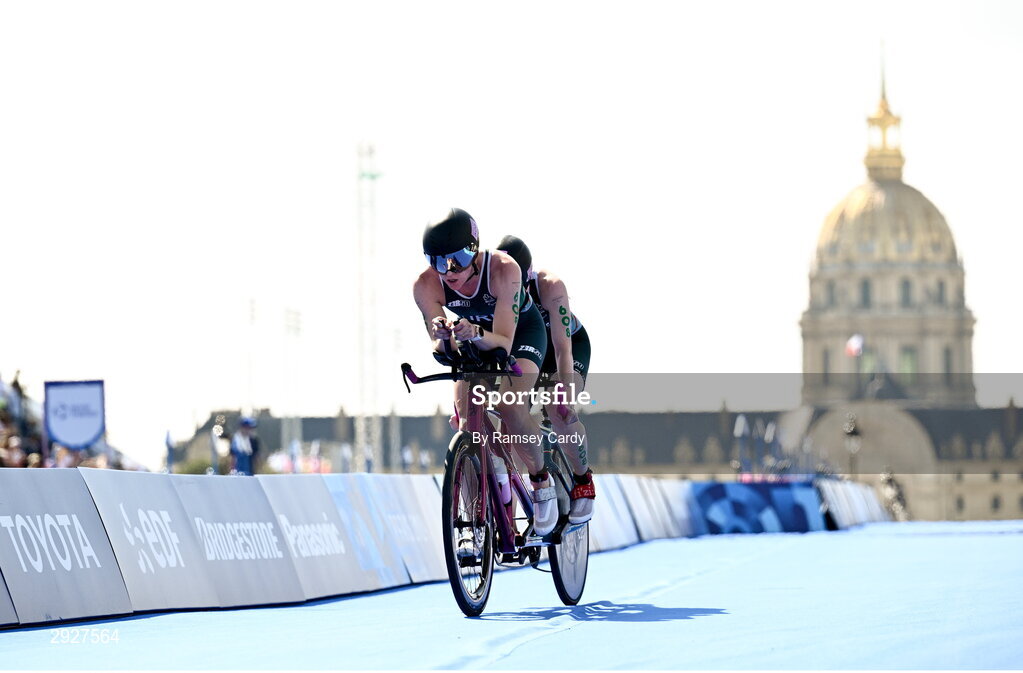 2 September 2024; Judith MacCombe, right, and guide Eimear Nicholls of Ireland in action during the women's PTVI race on day five of the Paris 2024 Paralympic Games at Pont Alexandre III in Paris, France. Photo by Ramsey Cardy/Sportsfile