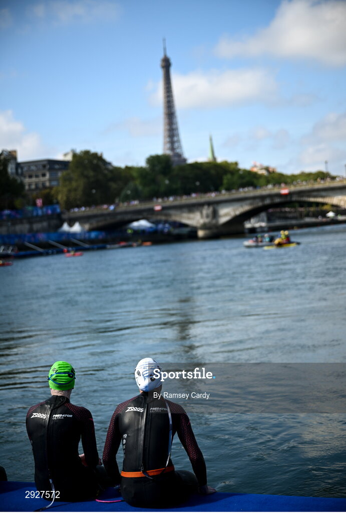 2 September 2024; Judith MacCombe, left, and guide Eimear Nicholls of Ireland before the women's PTVI race on day five of the Paris 2024 Paralympic Games at Pont Alexandre III in Paris, France. Photo by Ramsey Cardy/Sportsfile