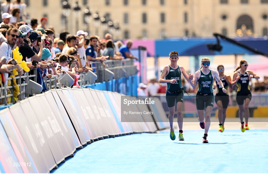 2 September 2024; Judith MacCombe, right, and guide Eimear Nicholls of Ireland on their way to finishing in eighth place during the women's PTVI race on day five of the Paris 2024 Paralympic Games at Pont Alexandre III in Paris, France. Photo by Ramsey Cardy/Sportsfile