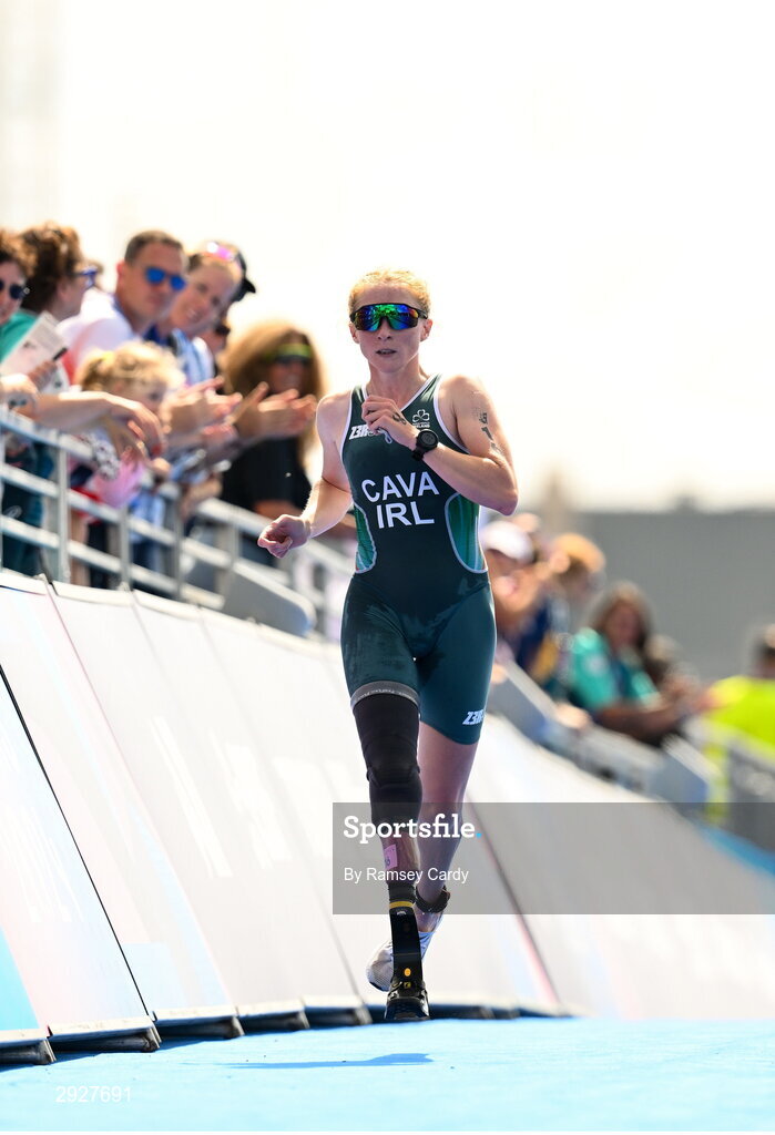 2 September 2024; Cassie Cava of Ireland on her way to finishing the women's PTS4 race on day five of the Paris 2024 Paralympic Games at Pont Alexandre III in Paris, France. Photo by Ramsey Cardy/Sportsfile
