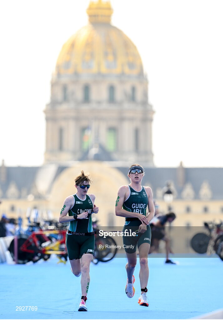 2 September 2024; Chloe MacCombe, left, and guide Catherine A Sands of Ireland in action during the women's PTVI race on day five of the Paris 2024 Paralympic Games at Pont Alexandre III in Paris, France. Photo by Ramsey Cardy/Sportsfile