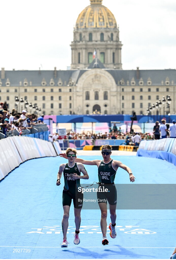 2 September 2024; Chloe MacCombe, left, and guide Catherine A Sands of Ireland in action during the women's PTVI race on day five of the Paris 2024 Paralympic Games at Pont Alexandre III in Paris, France. Photo by Ramsey Cardy/Sportsfile