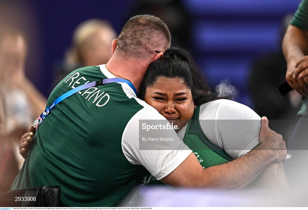 7 September 2024; Britney Arendse of Ireland with coach Tadgh Buckley during the women's 79kg final on day ten of the Paris 2024 Paralympic Games at Porte de la Chapelle Arena in Paris, France. Photo by Harry Murphy/Sportsfile