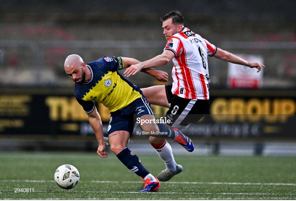 14 September 2024; Mark Coyle of Shelbourne in action against Will Patching of Derry City during the Sports Direct Men's FAI Cup Quarter Final match between Derry City and Shelbourne at the The Ryan McBride Brandywell Stadium in Derry. Photo by Ben McShane/Sportsfile