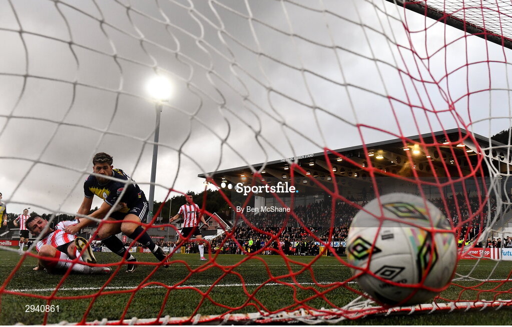 14 September 2024; Danny Mullen of Derry City scores his side's second goal despite the tackle of Sam Bone of Shelbourne during the Sports Direct Men's FAI Cup Quarter Final match between Derry City and Shelbourne at the The Ryan McBride Brandywell Stadium in Derry. Photo by Ben McShane/Sportsfile