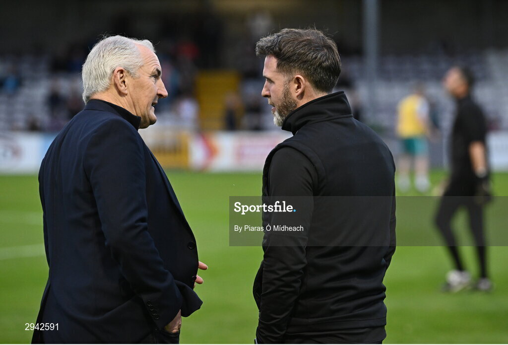 16 September 2024; Galway United manager John Caulfield and Shamrock Rovers manager Stephen Bradley, right, before the SSE Airtricity Men's Premier Division match between Galway United and Shamrock Rovers at Eamonn Deacy Park in Galway. Photo by Piaras Ó Mídheach/Sportsfile