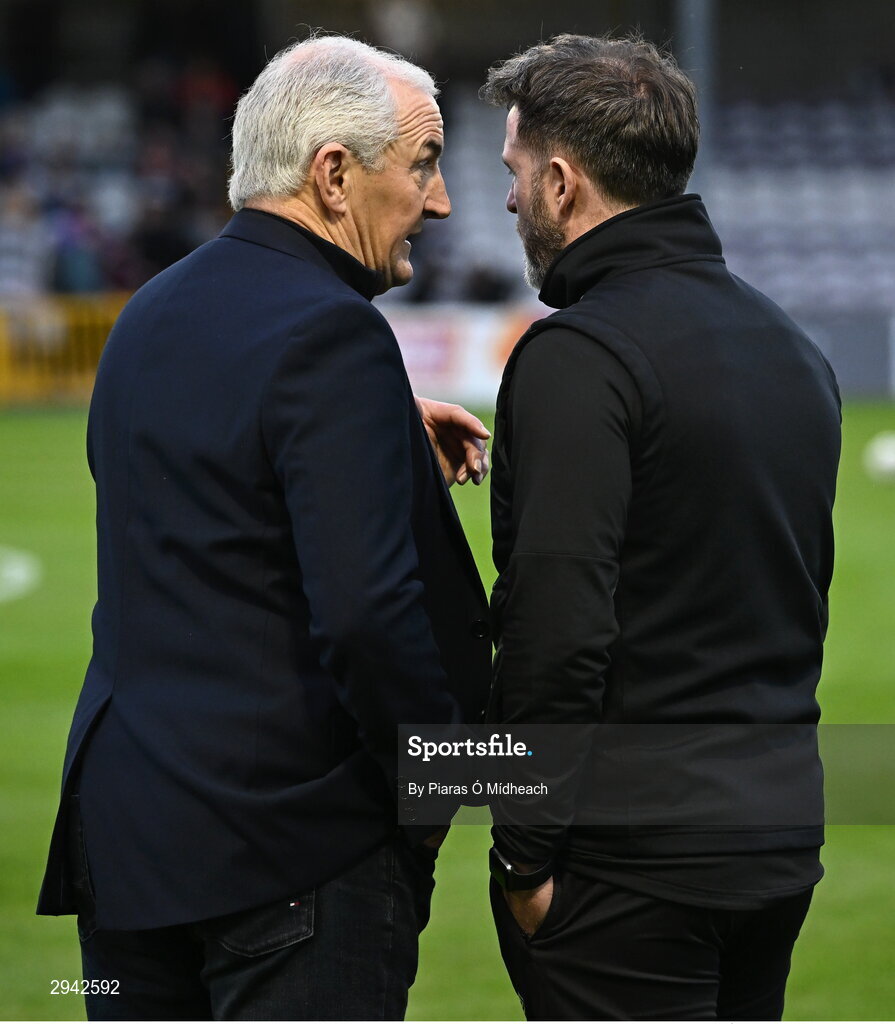 16 September 2024; Galway United manager John Caulfield and Shamrock Rovers manager Stephen Bradley, right, before the SSE Airtricity Men's Premier Division match between Galway United and Shamrock Rovers at Eamonn Deacy Park in Galway. Photo by Piaras Ó Mídheach/Sportsfile