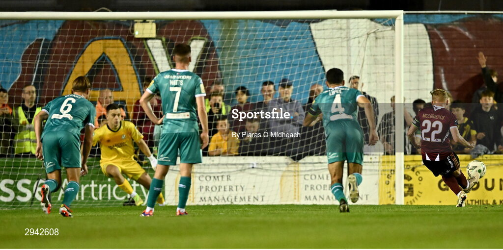 16 September 2024; Conor McCormack of Galway United shoots to score his side's first goal, from a penalty, past Shamrock Rovers goalkeeper Leon Pohls during the SSE Airtricity Men's Premier Division match between Galway United and Shamrock Rovers at Eamonn Deacy Park in Galway. Photo by Piaras Ó Mídheach/Sportsfile