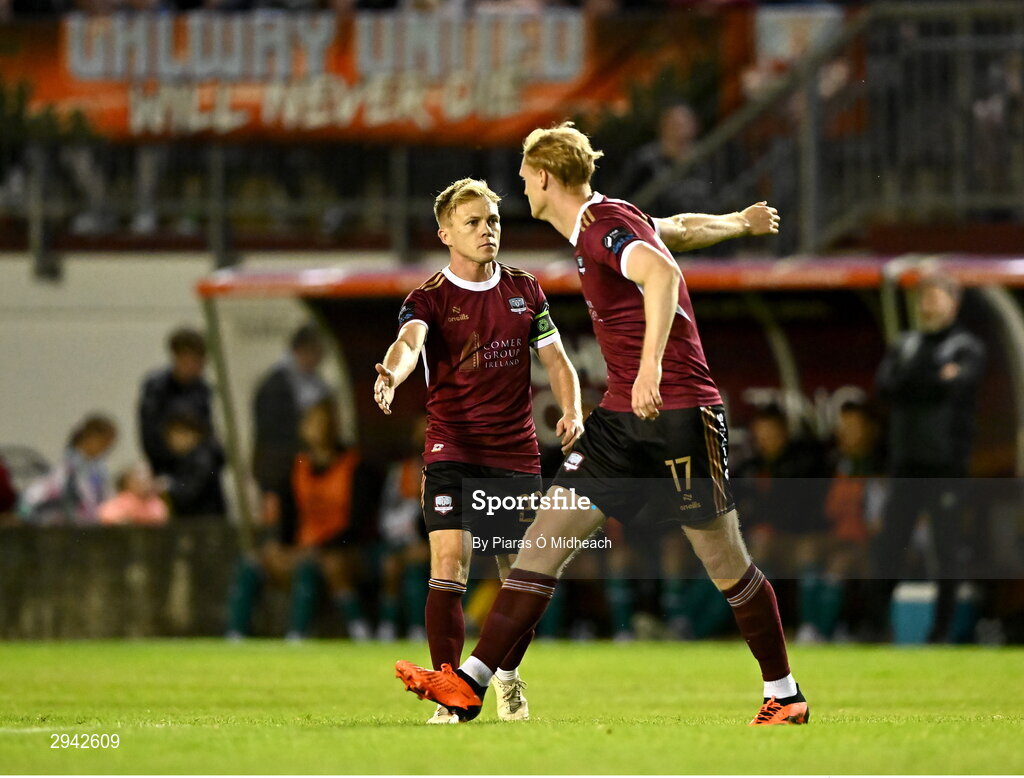 16 September 2024; Conor McCormack of Galway United celebrates with team-mate Vincent Borden, right, after scoring his side's first goal, from a penalty, during the SSE Airtricity Men's Premier Division match between Galway United and Shamrock Rovers at Eamonn Deacy Park in Galway. Photo by Piaras Ó Mídheach/Sportsfile