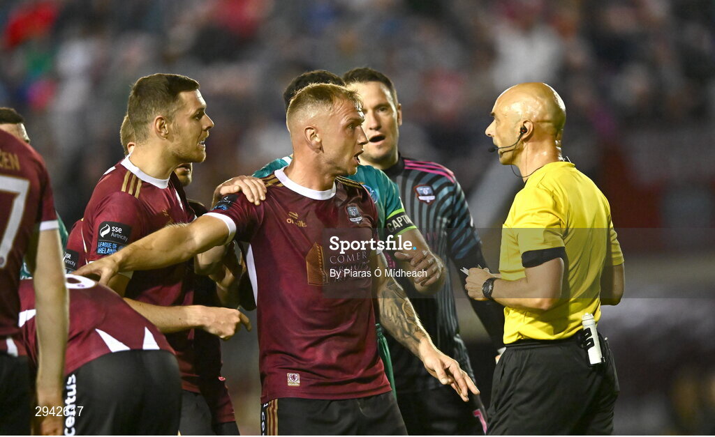 16 September 2024; Stephen Walsh of Galway United in conversation with referee Neil Doyle during the SSE Airtricity Men's Premier Division match between Galway United and Shamrock Rovers at Eamonn Deacy Park in Galway. Photo by Piaras Ó Mídheach/Sportsfile