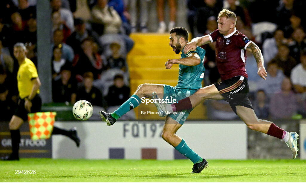 16 September 2024; Roberto Lopes of Shamrock Rovers in action against Stephen Walsh of Galway United during the SSE Airtricity Men's Premier Division match between Galway United and Shamrock Rovers at Eamonn Deacy Park in Galway. Photo by Piaras Ó Mídheach/Sportsfile