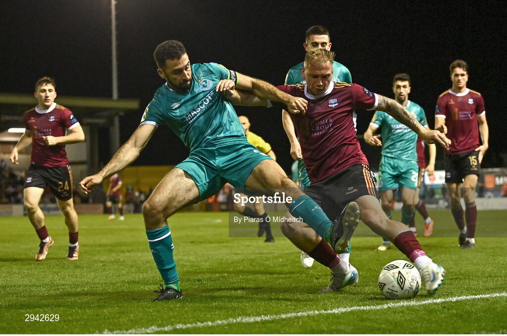 16 September 2024; Stephen Walsh of Galway United in action against Roberto Lopes of Shamrock Rovers during the SSE Airtricity Men's Premier Division match between Galway United and Shamrock Rovers at Eamonn Deacy Park in Galway. Photo by Piaras Ó Mídheach/Sportsfile