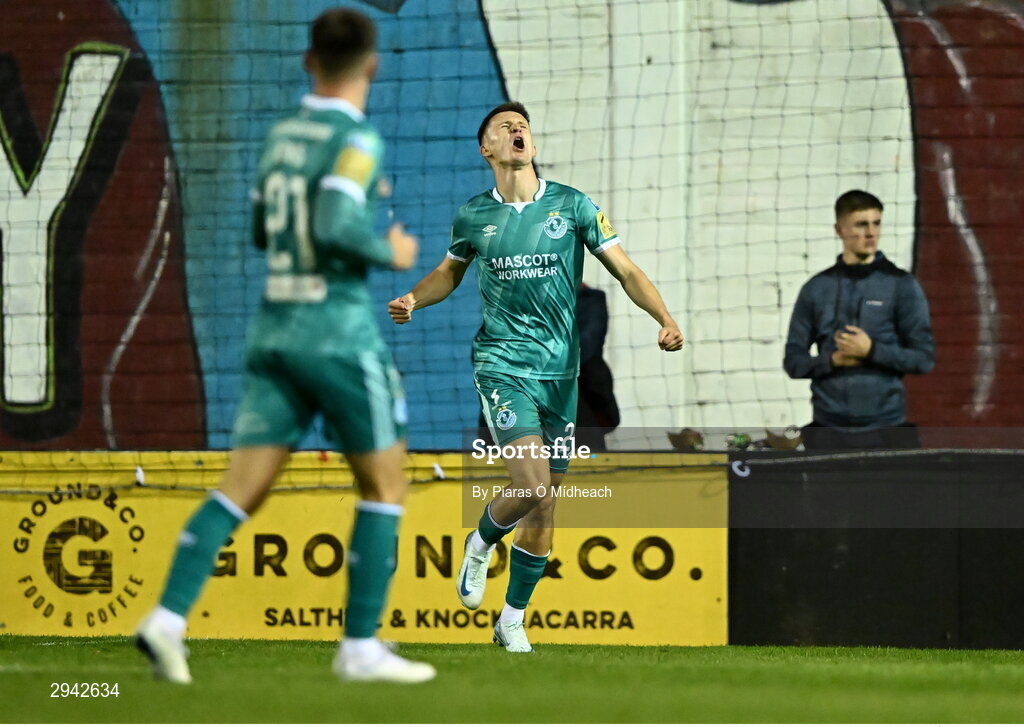 16 September 2024; Johnny Kenny of Shamrock Rovers, right, celebrates after his side's second goal, an own goal by Garry Buckley of Galway United, during the SSE Airtricity Men's Premier Division match between Galway United and Shamrock Rovers at Eamonn Deacy Park in Galway. Photo by Piaras Ó Mídheach/Sportsfile