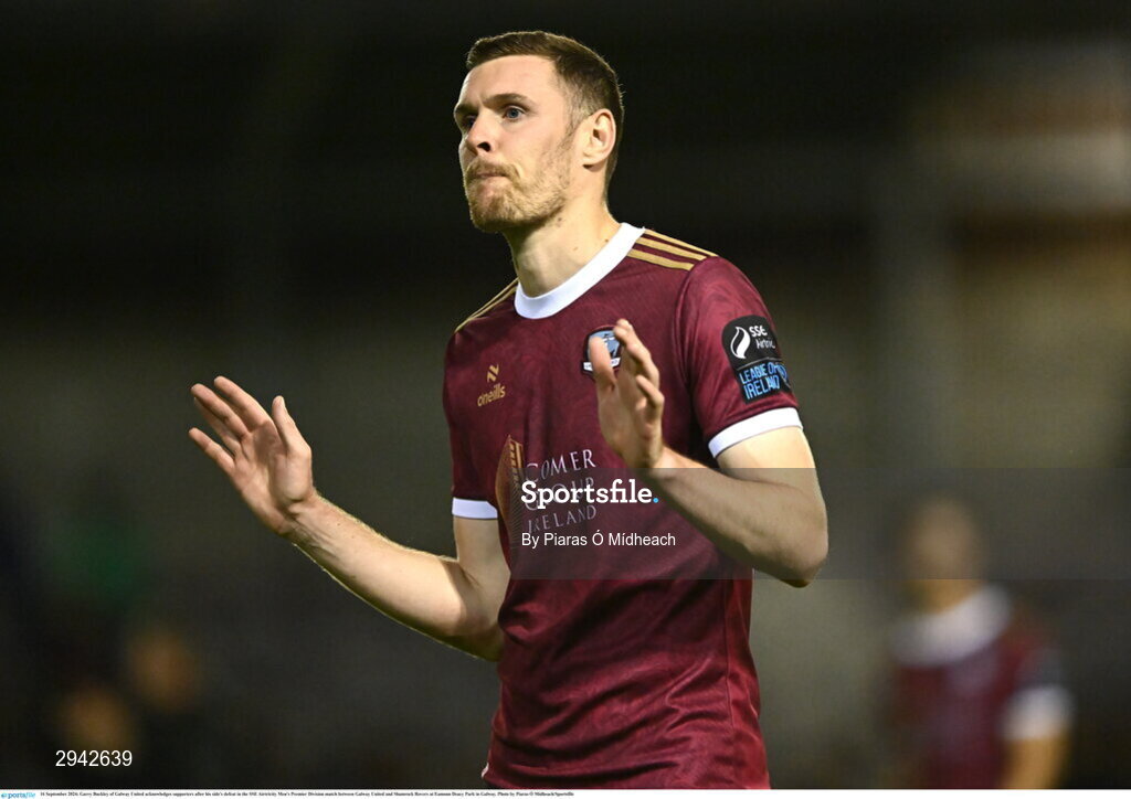16 September 2024; Garry Buckley of Galway United acknowledges supporters after his side's defeat in the SSE Airtricity Men's Premier Division match between Galway United and Shamrock Rovers at Eamonn Deacy Park in Galway. Photo by Piaras Ó Mídheach/Sportsfile